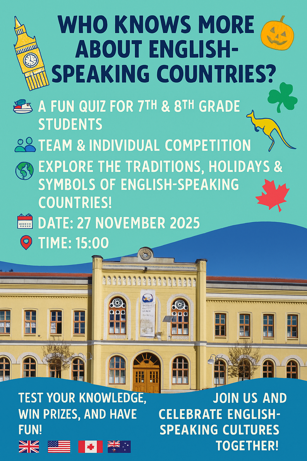 Szeretettel meghívunk Benneteket egy vidám angolos vetélkedőre, amelyet 2025. november 27-én rendezünk meg a Bocskai István Gimnáziumban!